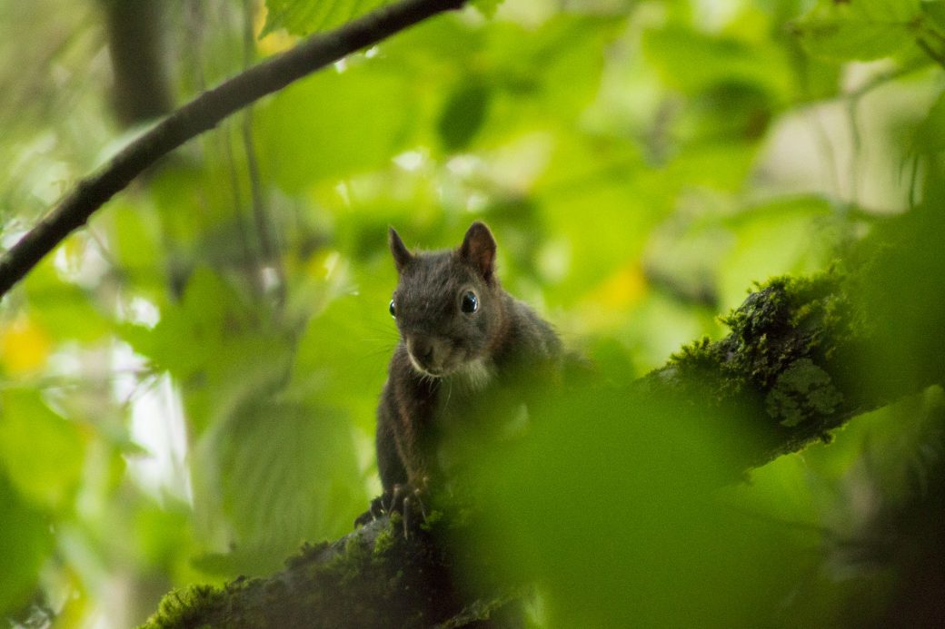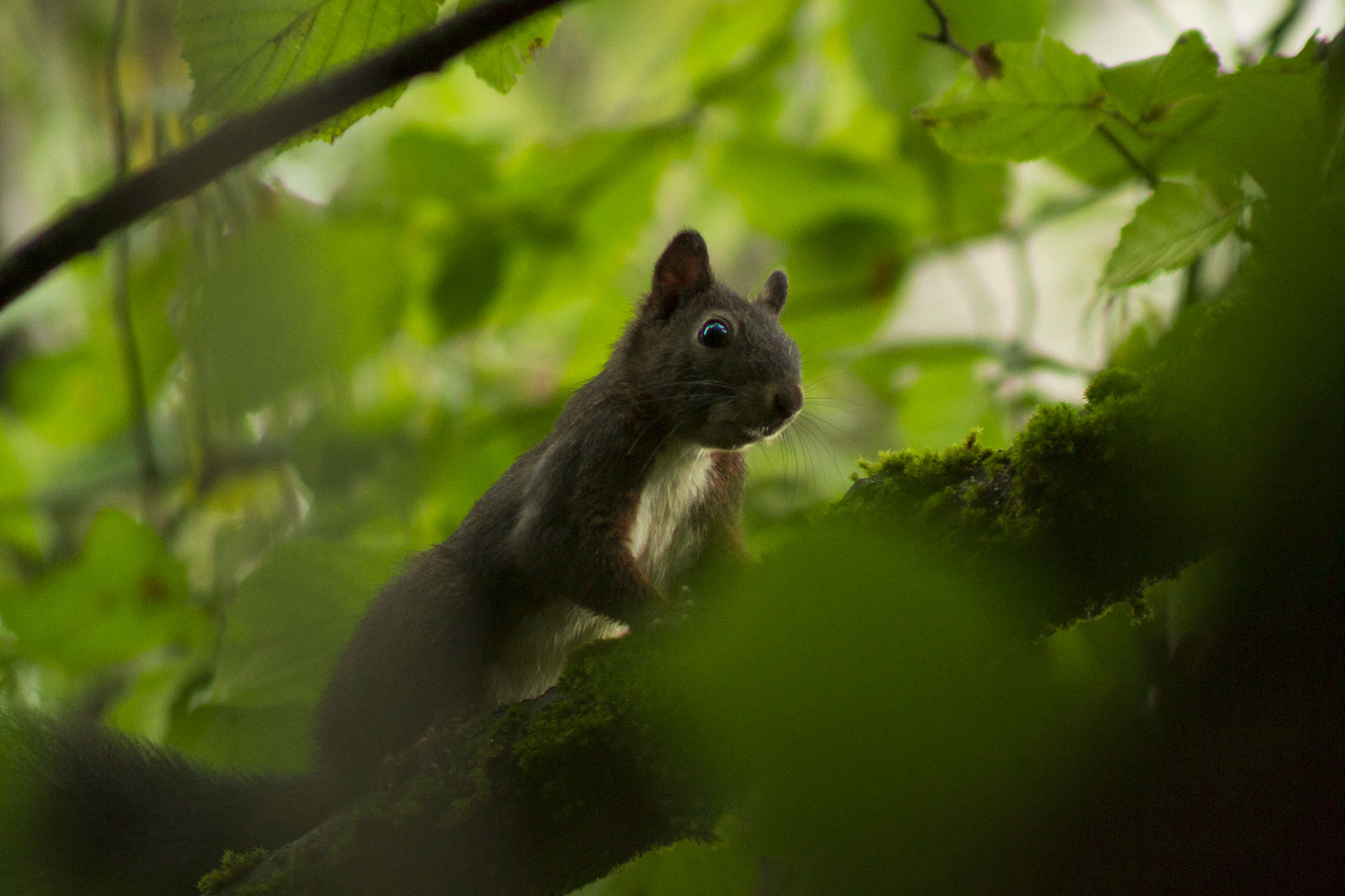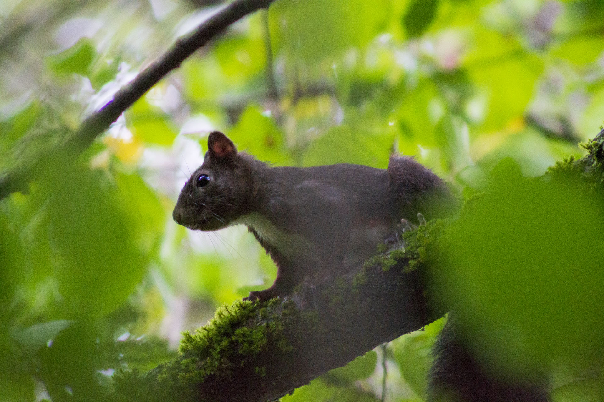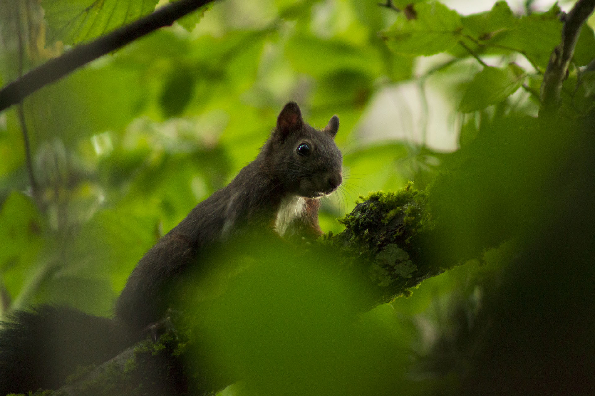 Soudain, à ma gauche, les branches remuent, j’entends alors un petit cri caractéristique : un écureuil ! Comme pour dire « Hey ! En fait je suis là ! Et tu es pile sur mes noisettes ! » En réalité, j’étais camouflé dans un bosquet de noisetiers, ou notre ami avait pris l’habitude de venir faire ses réserves. Il s’est perché sur une branche et m’a observé avec curiosité. « Tiens, le gars qui habite plus loin, qu’est-ce qu’il fout là ? » Nous nous sommes regardés quelques minutes. L’animal se laissant tirer le portrait assez facilement, comme vous pouvez le voir. Puis je me suis éloigné lentement et il a pu reprendre ses petites affaires…